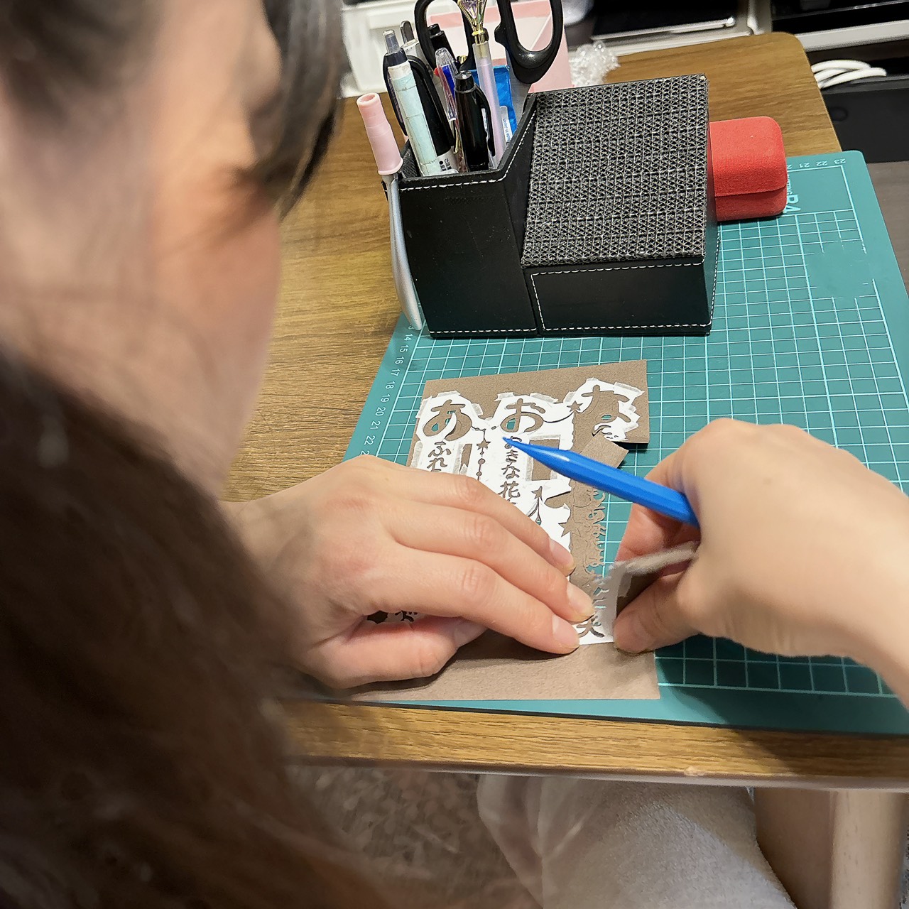 好きなカラーや、好きな事をイメージできるようなデザインにして、数枚の切り絵を重ねて一つの作品に仕上げます。