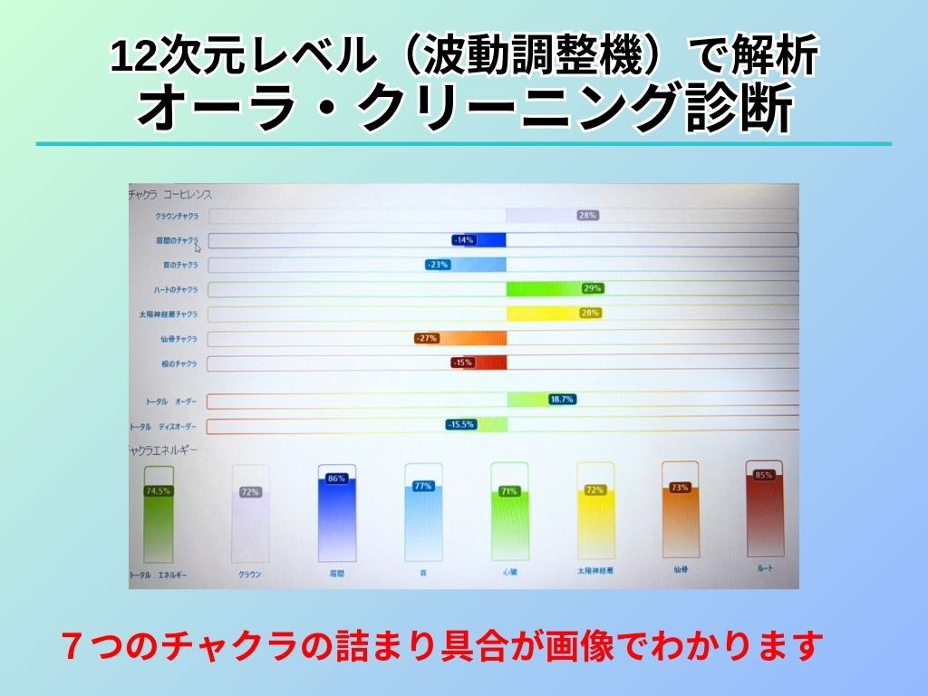12次元波動調整機タイムウェーバーを使った「オーラ・クリーニング診断」では、これら7つのチャクラの状態を徹底分析し、ご希望で今のあなたに必要なエネルギー調整を行います。