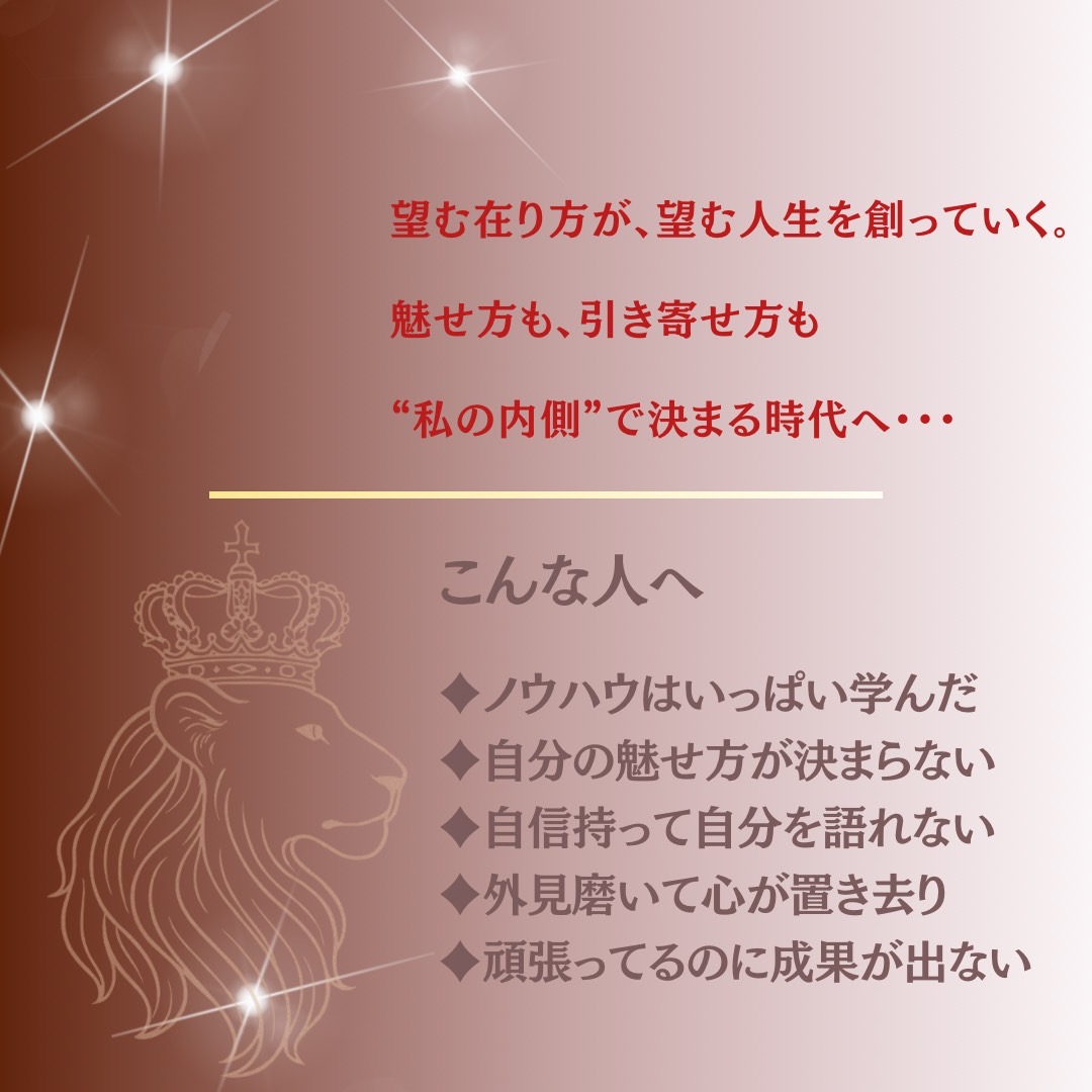 通常3ヶ月かけて取り組むプログラムの入り口として、90分の濃密な時間を通じて本来の美しさや自分らしさを引き出し、心の軸を取り戻すことが可能です。