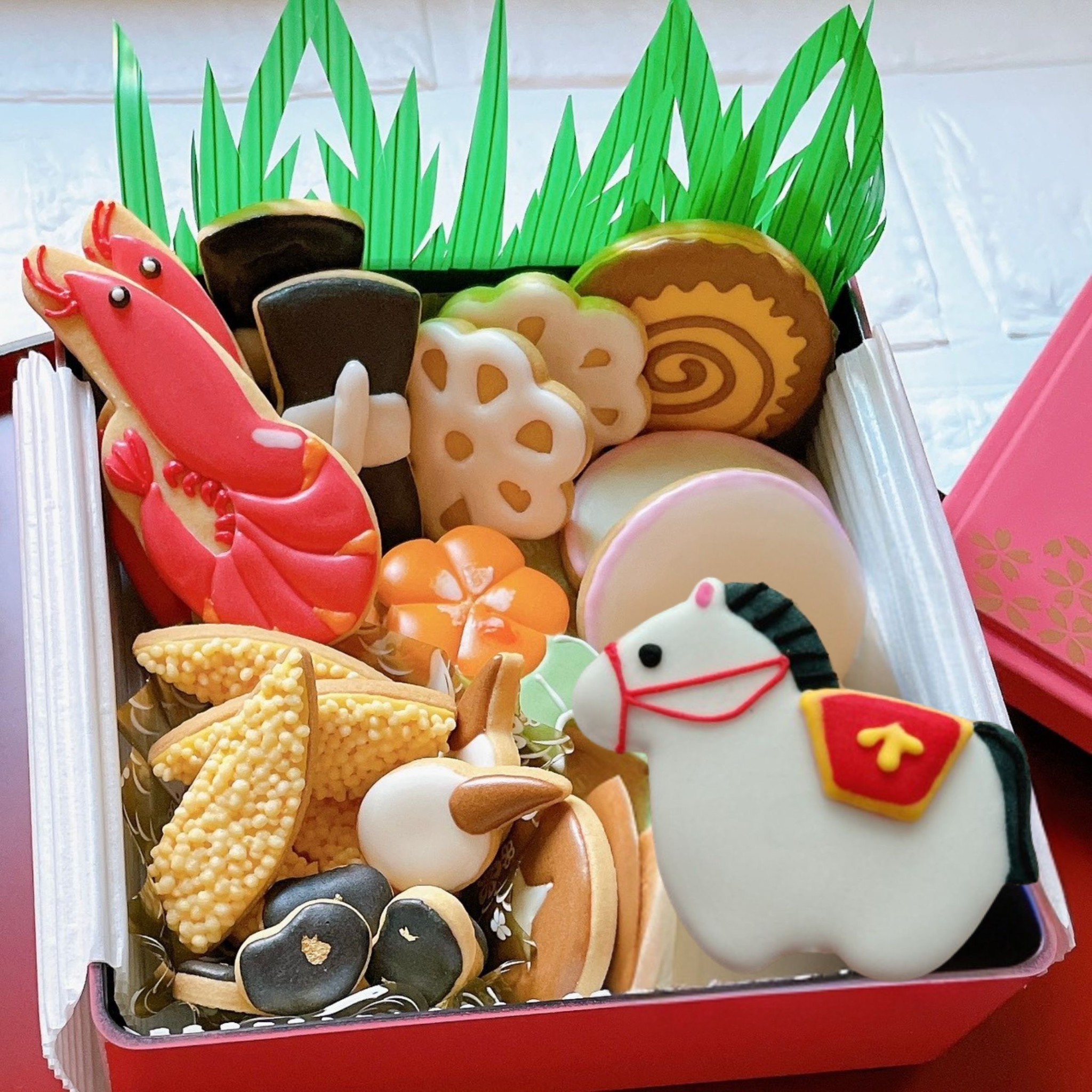 5〜6種類の身体にやさしい米粉クッキーを下に敷き詰め、トップには見るだけでほっこり可愛い【おせち料理】と干支の午(うま)のアイシングクッキーを並べてます!